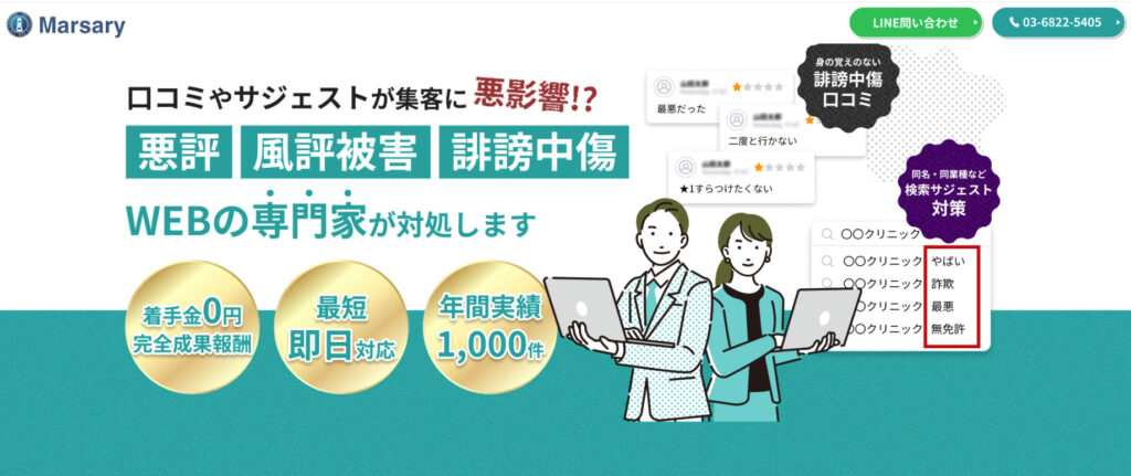 主には企業向けのWEB誹謗中傷・風評被害対策のサービスを行なってる業者です。企業名などの検索結果がネガティブな言葉でマイナスのイメージを与えてしまうことへの対策が多いです。ですのでサジェスト対策にも力を入れているのが特徴です。特に大きな特徴としては、サイトの非表示です。ブログサイトや口コミサイト、掲示板サイトそのものを非表示にするので、追い打ちで書き込ませることもできなくなります。