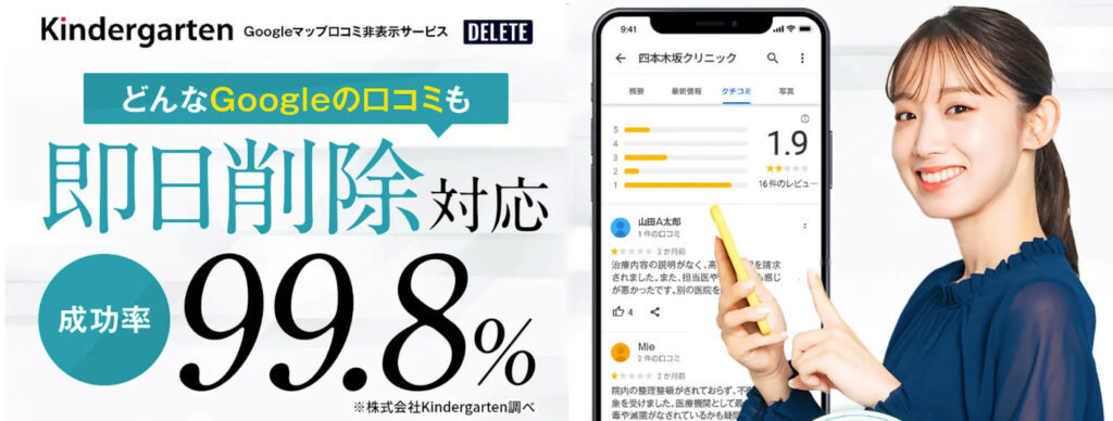 口コミ削除を即日削除対応で、成功率99.8%を掲げる、Googleマップ非表示サービスのキンダーガーデンです。他にも初期費用なしや無料相談、そして完全成果報酬というのはとても安心できるポイントです。他との違いとしては司法書士とIT技術者による口コミの消去・非表示サービスのDELETEです。インターネット上の法律問題に長けた司法書士有資格者の監修があるのは安心です。